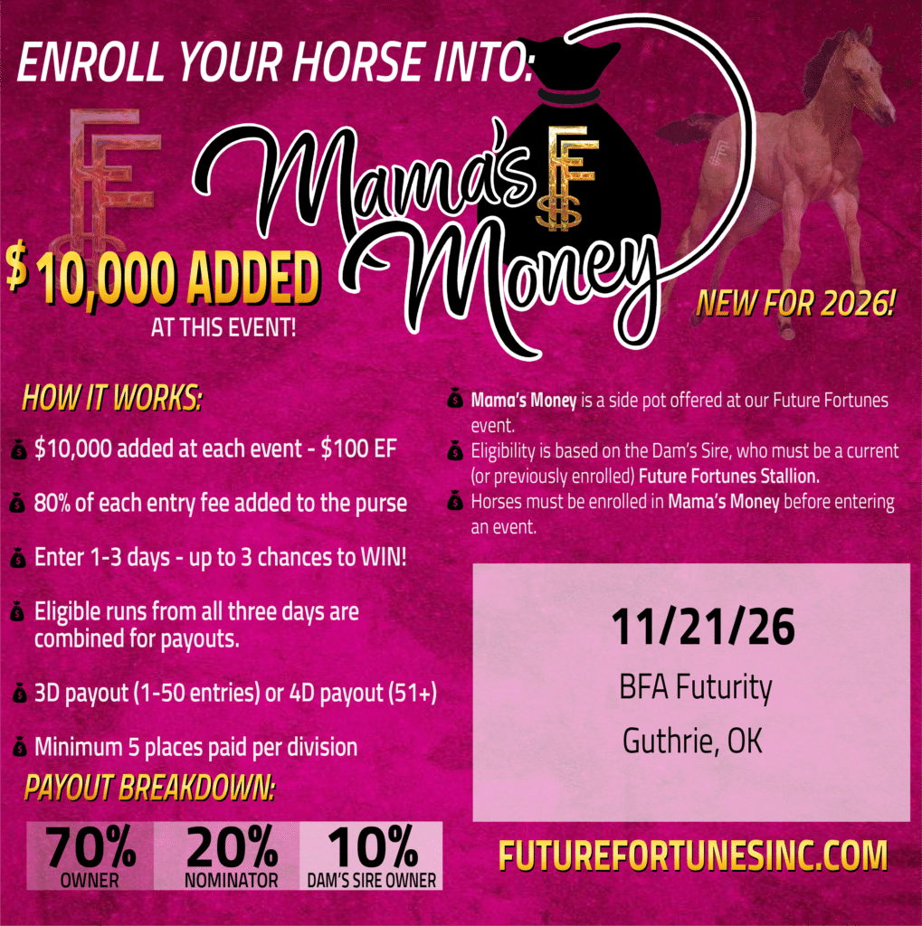 Mama’s Money is a side pot that is offered in conjunction with selected Future Fortunes’ events. Eligibility is based on the Dam’s Sire, who must be a current or previously enrolled Future Fortunes Stallion.